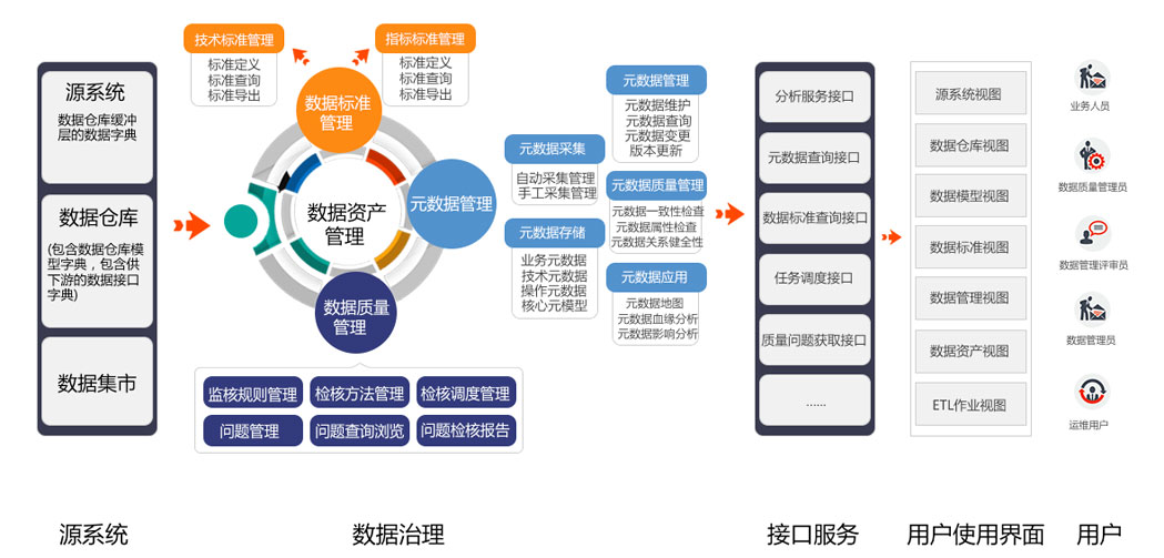 支持国内主流厂商的数据中心、业务系统;可在其系统上叠加数据治理产品实现元数据管理,数据质量管理及数据资产管理等应用。